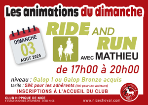 Le RIDE AND RUN est une discipline équestre d’extérieur en binôme, pour laquelle un concurrent est à cheval ou à poney et l’autre à pied. Une épreuve de Ride & Run se déroule sur un parcours balisé. Le cavalier et le runner échangent de rôles à plusieurs reprises durant le parcours. Le but est de boucler le parcours ensemble, le plus rapidement possible…